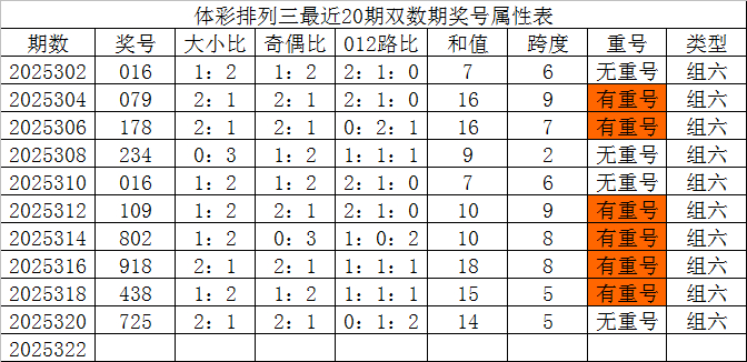 体彩排列三最近20期双数期奖号分别为:016、079、178、234、016、109、802、918、438、725,各期奖号详细属性下表: