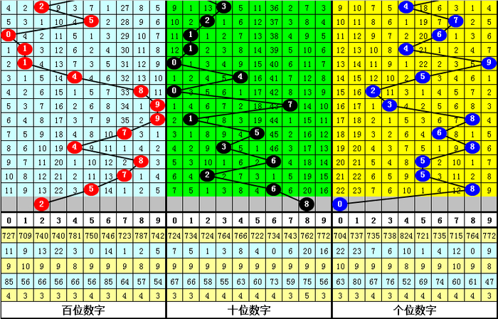 其中,号码0-9开出次数分别为:号码0开出1次、1开出3次、2开出3次、3开出3次、4开出5次、5开出2次、6开出0次、7开出5次、8开出3次、9开出5次。